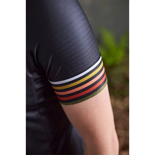 Dieses AirDry Trikot hat ein klares Design mit einem Kettenblatt-Logo auf der Brust. Die Ärmel sind aus einem hochelastischen Stoff, dem sogenannten Cell Mesh, gefertigt und bieten eine tolle Passform. Ein verstecktes Feature sind die Armabschlüsse, die gekrempelt ein buntes Streifen-Design zeigen. Drei Rückentaschen bieten viel Platz für längere Fahrten und sind mit einem „organisierten Buchstaben-Chaos“ verziert.
