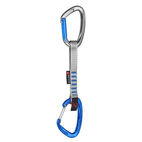 Bei diesem Express Set werden die beiden Crag-Karabiner durch eine Polyester-Schlinge mit Indicator-Technologie verbunden: Bei Verletzungen und Abrieb am Bandmaterial tritt der rote Kern zum Vorschein und zeigt die zwingende Auswechslung der Schlinge an.